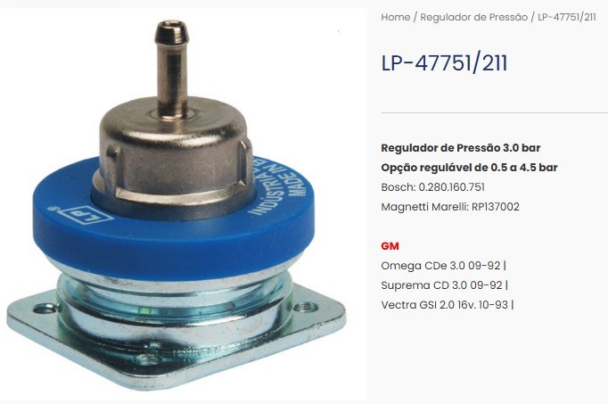 AdicionarREG.PRESSAO 3.0 BAR OMEGA CD/ SUPREMA CO 3.0/ VECTRA GSI 2.0 16V 92/... - SIMILAR: 0.280.160.751/RP137002/LP-47751/211 - UN