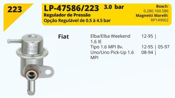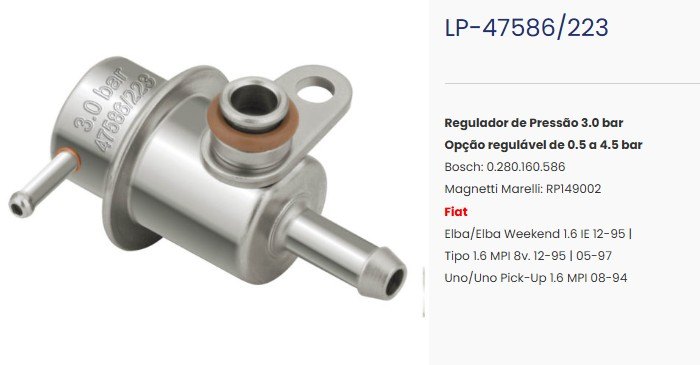 AdicionarREG.PRESSAO 3.0 BAR ELBA/ UNO/ WEEKEND 1.6 IE - SIMILAR: 0.280.10.586/RP149002/LP-47586/223 - UN