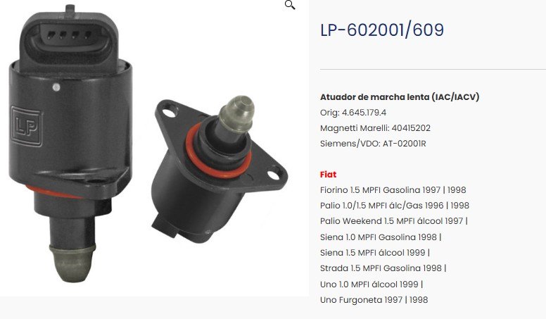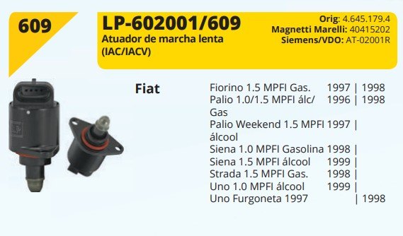 AdicionarATUAD. MARCHA LENTA FIAT PALIO/WEEKEND/SIENA/UNO - SIMILAR: 4.645.179./40415202/LP-602001/609 - UN