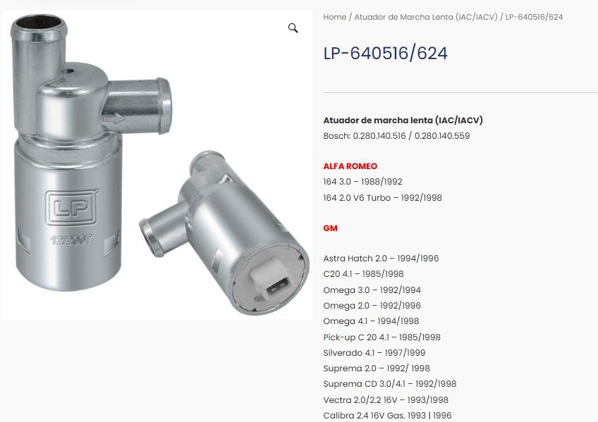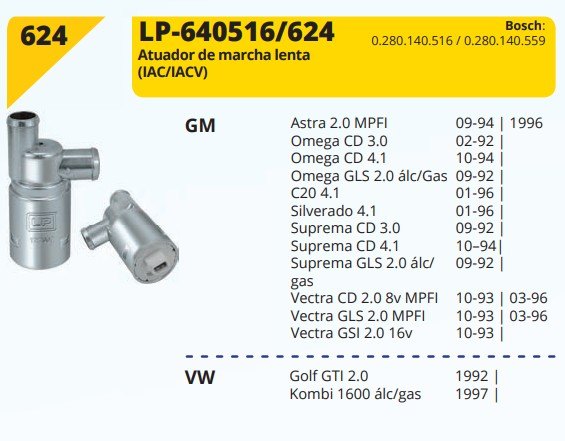 AdicionarATUAD. MARCHA LENTA GM VECTRA/ OMEGA/ VW GOLF/ KOMBI - SIMILAR: 0.280.140.516/0.280.140.559/LP-640516/624 - UN